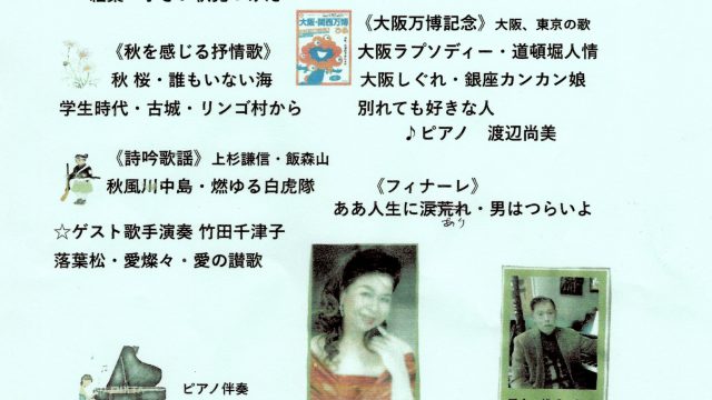 タキタン仲良し文庫 懐かしい歌をピアノ伴奏で唄う会 歌で明治・大正・昭和時代の流れや世相を学ぶ ☆歌う曲が何年に作られたか、歌う事で歴史的人物や歌手を知る、その時代の背景など浮んで来るのは人生の物語、どんな種類の歌も受け入れ楽しく歌う、歌の辞書の会です。 ♫《今はもう秋、誰もいない海》 《唱... 2025.10.07 タキタン仲良し文庫滝野川界隈のあれこれ隊員とその仲間たち